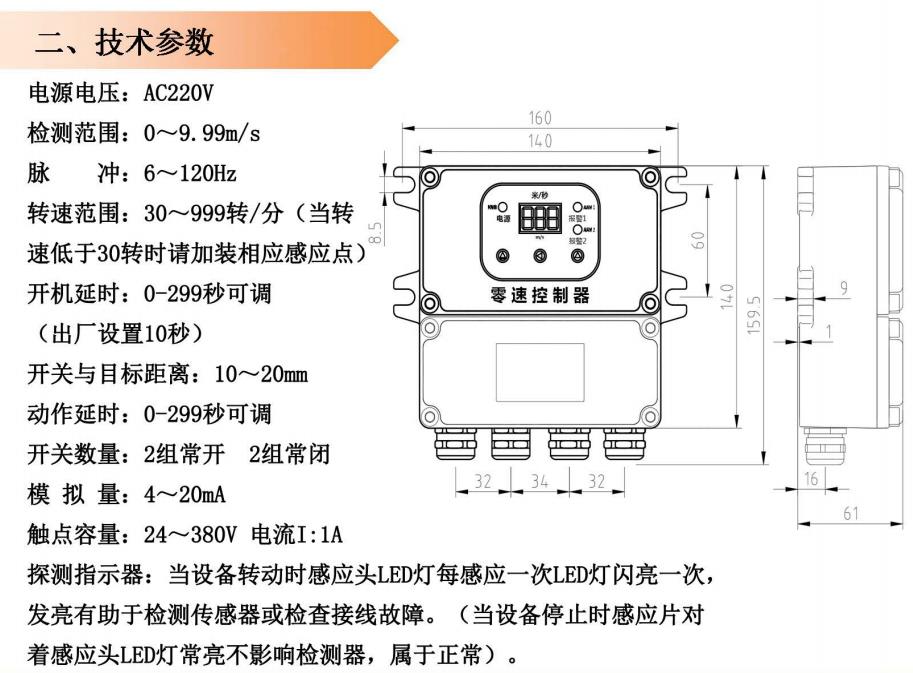 概述 該檢測(cè)器是一種經(jīng)濟(jì)、可靠性強(qiáng)、對(duì)軸轉(zhuǎn)速及其他旋轉(zhuǎn)裝置簡(jiǎn)單通用的檢測(cè)裝置,當(dāng)檢測(cè)到目前信號(hào)低于或高于正常轉(zhuǎn)速范圍,開關(guān)輸出兩組開關(guān)信號(hào),以供報(bào)警或停機(jī)。無(wú)運(yùn)動(dòng)部件、無(wú)磨損、安全壽命長(zhǎng),一體化結(jié)構(gòu),集中的控制裝置,設(shè)定或故障檢修簡(jiǎn)單。外殼采用防水、防塵的殼體,可直接安裝在惡劣環(huán)境中使用。